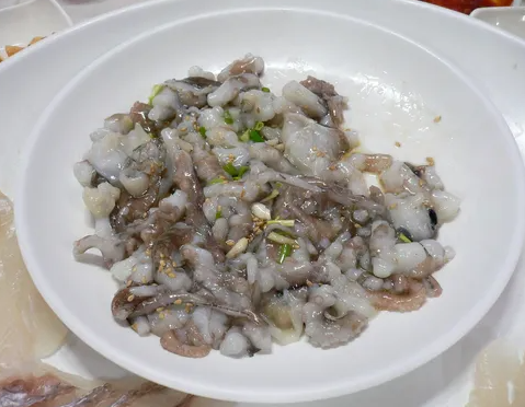 2. 기절낙지: 물고기 문질러 낙지를 기절시킨 뒤 다리를 손으로 찢어 접시에 담아내는 요리법입니다. 부드러우면서도 산 낙지의 쫄깃함이 느껴집니다.