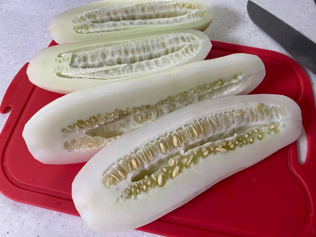3. 반으로 가르기: 깨끗하게 깐 노각을 반으로 가르세요. 노각은 씨가 존재하지 않는다고 하셨지만, 어떤 종류의 노각은 약간의 작은 씨가 있을 수 있으니 확인하고 있다면 제거해 주세요.